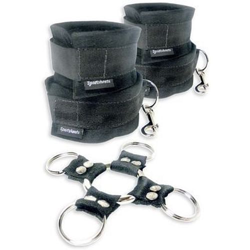 Quick and easy way to secure your partner with the 5 piece Hog Tie Set. Comes with 4 adjustable cuffs for wrist and ankles.