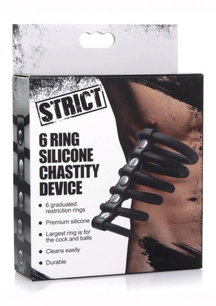 Cage up your lover’s erection and deny them the sexual gratification they crave with this kinky chastity device! Perfect for couples who dabble in chastity and orgasm denial – this set of 6 rings snugly hugs the shaft of your lover from head to base to mentally and physically cage their sexual wants. Cage their cock and tease their senses with your choice of toys and restraints! Tie up their body and immerse yourself in a genuine BDSM scene with this chastity device as the cherry on top – the velvety silicone is slightly stretchy for comfort and satisfaction during wear. The premium silicone and PU leather material stand up to the roughest of playstyles! The silicone used is phthalate free and body-safe so you can cage yourself or your lover worry-free. Measurements : Overall length 3.2 inches, inner diameter smallest ring 0.9 inches, inner diameter largest ring 1.5 inches Materials : Silicone, PU leather, Metal Color : Black