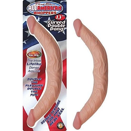 All American Whopper 13 inches Curved Double Dong is made using Better-than- Realskin. Two smooth heads for easy entry. Veined texture for that real feel. Waterproof, non-vibrating realistic dildo. Material PVC. Size 13 inches long by 1.6 inches wide.