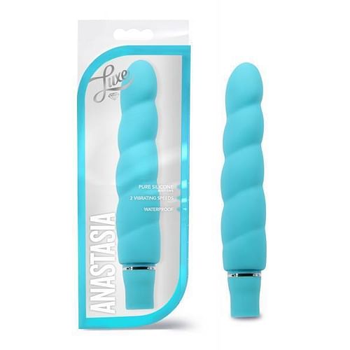 Anastasia Aqua Vibrator is seductive shape embodies the spirit of Blush Novelties Luxe line. Gorgeous to behold and sensuous to the touch with a smooth satin finish. Set in motion her duet of push button vibrations with 1 AA battery, not included. Made of pure body safe silicone, the vibrations radiate freely over the spirals. Anastasia has a waterproof motor to ensure safe shower play. Specifications: 10 speeds of vibrations. 1 touch operation. Waterproof vibrations. Ribbed shape. Smooth satin finish. Silicone. Phthalates and Latex Free. Length 6.5 inches. Insertable 5.5 inches. Width 1.25 inches. Circumference 3.5 inches. Bulk weight 2.4 ounces. Product Package Dimensions: 8.50 inches Height by 2 inches Width by 2.2 inches Depth. Product package weight 3.4 ounces. How to use: for power insert 1 AA battery. Push button on bottom. To cleanse Anastasia run water and apply a mild soap or wipe with a choice toy cleaner, then let air dry.