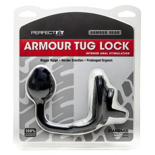 Armour Tug lock features the Armour Tug cock ring which is attached to a butt plug with a 5.5 inches circumference for added stimulation. The strap gives the user an amazing separation of your penis and scrotum while giving a bigger lift. It is designed with a revolutionary anatomical shape that hugs your torso and pushes your gear out entirely from your body to enhance your penis and scrotum. Armour Tug Lock is made of Perfect Fit Blend which is a proprietary blend of Silicone and Thermoplastic Rubber TPR developed to provide superior stretch, comfort and durability. Armour Tug Lock comes in the standard 1.7 inches size. Safe with water based lubes.
