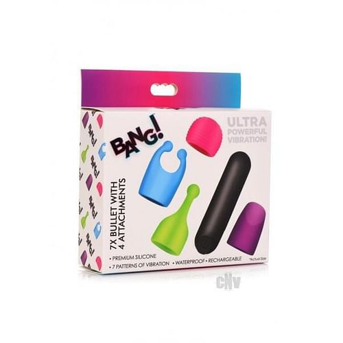This powerful bullet comes with 4 attachments that each add a uniquuly stimulating sensation to the mix! The powerful bullet itself has 7 different vibration patterns and is fully rechargeable. Each attachment is slightly different. The pink attachment is round with rows of ridges. The green attachment has a pinpoint end to get exactly the right spot. The blue attachment has a double pinpoint ends with round tips, similar to a rabbit vibe. Lastly, the purple attachment is similar to a flat, lipstick shape for more dispersed vibration. As an added bonus, all of the attachments are glow-in-the-dark for extra fun at night! Bring this toy into the bath, shower or hot tub with you! The premium, silky smooth, phthalate-free silicone is also wateprroof and can be submerged under water for up to 30 minutes! After play time is over, wash with warm water and mild soap, then spray with a toy cleaner. Use only with water-based lubricants. Recharge using the jackpin USB charging cable. With so many options to choose from, you can really give your little pearl a treat! Turn the vibe on and grab your favorite water-based lube. Massage the lube on the tip of the attachment and then rub a little on yourself, as well. Once you`re feeling slick and slippery, try one attachment at a time, cycling through the different vibration settings, massaging your clitoris and labia until you find those sweet spots. Enjoy alone or with a partner! Measurements: Bullet: 3 inches Length x 0.8 inches WidthBlue attachment: 1.7 inches x 1.1 inches Green attachment: 1.9 inches x 0.9 inchesPink attachment: 0.9 inches x 1.1 inchesPurple attachment: 1.4 inches x 0.9 inches Materials: Silicone, ABS plastic Color: Purple, Blue, Pink, Green, Black Note: Waterproof rating of IPX7. Key Features:Powerful Rechargeable Bullet: This powerful bullet by Bang! packs a powerful punch with 7 different vibration patterns.Four Glow-In-The-Dark Attachments: Enjoy switching up the sensations with 4 different attachment heads! Try out the green, pinpoint tip, the ribbed, round pink tip, the double ballpoint rabbit tip in blue, and the purple, flat, lipstick tip. As an added bonus, all attachments are also glow-in-the-dark!Waterproof, Premium Silicone: Bring your toy in the shower, bathtub or hot tub! This premium, phthalate-free silicone toy also has an IPX7 waterproof rting.Rechargeable: Get a full charge with the jackpin USB charging cable. Full recharge after one hour.
