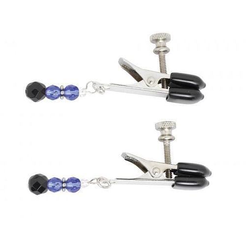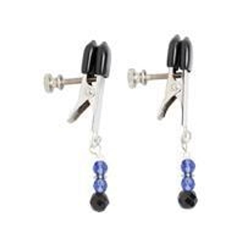 Adjustable wide alligator style beaded nipple clamps with sapphire blue beads. Soft rubber tips. Adjust the clamps by twisting the thumb screw from merely lovely decoration to pretty strong stimulation. Sold as a pair.