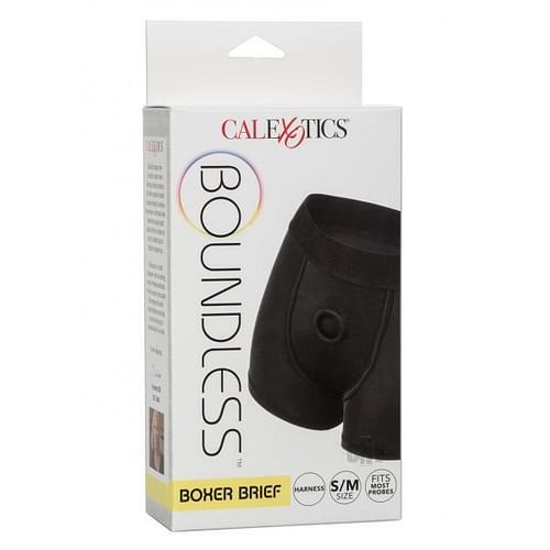 The Boundless Boxer Brief Harness is an ultra-comfortable, easy wear harness designed with powerful performance and comfort in mind. This classic harness has a supportive extra-wide waistband, soft stretchy material and internal probe straps for the ultimate support. Enjoy easy access to your favorite probe with the accommodating double panel interior design. The durable, reinforced O-ring stretches to accommodate your favorite packer, vibrator or dildo.Beginners and expert users alike will love frustration-free pleasure with this easy-to-wear harness. Simply secure your favorite probe, slip into the extra stretchy waist and thigh straps and dive deep into passionate penetration or enjoy comfortable all-day wear. Enjoy easy clean up by machine washing and hanging to dry. Size Small to Medium