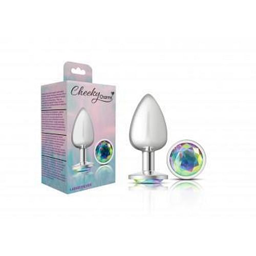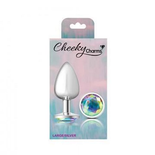 Cheeky Charms Round Clear Iridescent Large Silver Butt Plug from Viben. Cheeky Charms is a collection of vibrant, seductive metal anal plugs, each show casing a beautiful Acrylic Gem Stone. These butt plugs are great for temperature play and anyone who wants to decorate their rear entrance. Tapered for easy insertion and designed with a flared base and thin stem. Cheeky Charms anal plugs are comfortable to wear for an extended period of time. Wearable during intercourse to achieve a fuller feeling. Available in various unique colors and sizes. Cheeky Charms are the perfect booty jewelry for women, men, couples and also for solo play. Large, silver metal, tear drop shaped anal plug with sparkling Iridescent colored, round Acrylic Gem Stone. Hypoallergenic, nonporous, body safe, Nickel free, Aluminum alloy, anal jewelry compatible with all lubricants. Easy to clean and dishwasher safe butt plugs. Available in various colors and three different sizes. Specifications: body safe materials. Nonporous, smooth surface. Aluminum Alloy. Nickel free. Ideal for temperature play. Never warm in a microwave. Run hot water and Aluminum place plug to warm. Or a chilly butt plug in a tub of ice. Tapered, tear drop shape. Thin Stem. Flared Base Anal Plug. Clear Iridescent Acrylic Gem Stone. Light weight. Easy to clean. Waterproof, non-vibrating anal sex toy. RoHS Certified, Prop 65 Compliant. 1 year Limited Warranty. Measurements: overall length 3.72 inches, insertion length 2.39 inches, circumference 5.25 inches around. Material: Aluminum Alloy Butt Plug, Acrylic Gem Stone. Categories: Anal Toys, Prostate Massagers, P-Spot Stimulators, Sex Toys for Couples, Health and Beauty Aids, Large, Huge Butt Plugs. Restricted, Amazon Restricted. 2022.