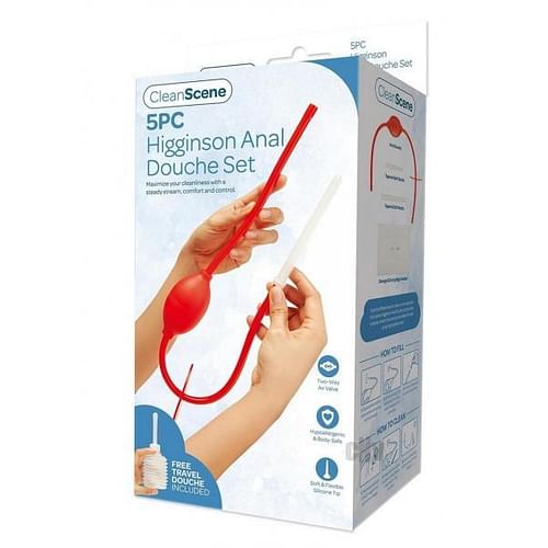 The 5 piece Higginson Anal Douche Set offers versatility with a convenient design. One end of the hose is fitted with an able nozzle, while the other end can be submerged in liquid, and the bulb allows for easy control of the flow.