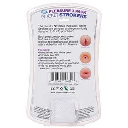 Cloud 9 Trio Stroker Pussy, Ass, Mouth Masturbator Kit with bonus drying pouch. Color Flesh Beige. The Cloud 9 Novelties Pleasure Pocket Strokers are compact and ergonomically designed to fit into your hand. Each pleasure pocket stroker features a velvety smooth realistic feel masturbator with a ribbed tunnel for your pleasure.