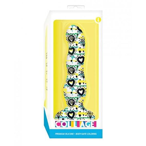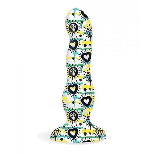 Collage Diamonds and Hearts Dildo from Icon Brands. Premium silicone adult toys, with beautiful, body safe coloring. Each piece is hand crafted for your unique pleasure. Eye popping designs tattooed right onto the silicone. Soft and silky and just the right size, they are colorful, whimsical, elegant and stunning. Each features and ultra grip suction cup which also makes them harness compatible. They quickly warm to your touch, are non-porous and easy to clean. Water based lubricant. Care: gentle soap and water to clean only, never an alcohol based soap. Size 7 inches in total length by 3.7 inches in width.
