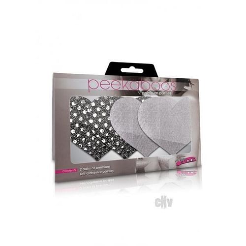 Peekaboos Premium Pasties. Wear more revealing fashions! Cover up with style! Lasts as long as you do. Dance all night without even a slip. Fun as a flirty fashion add on or just as premium pasties. Contains two pairs of premium self-adhesive pasties. Dark Angel Hearts Silver.
