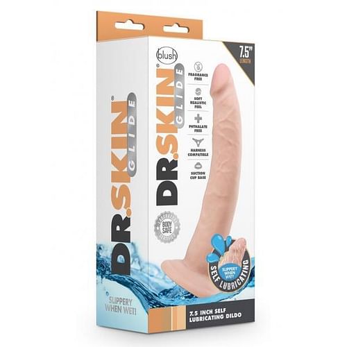 The doctor is in! The Dr. Skin Glide 7.5 Inch Self Lubricating Dildo is a realistic, self lubricating toy that only needs a bit of water to get slippery! The Dr. Skin Glide has a sturdy suction cup base that will hold to any flat surface and is harness compatible. Made from body safe TPE, this toy contains no Fragrances, Phthalates, Paraffins, or Latex.