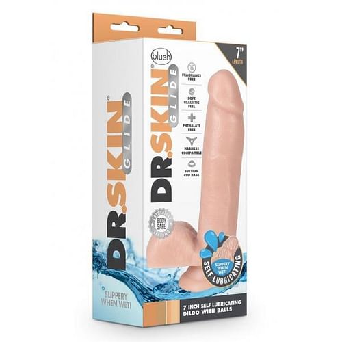 The doctor is in! The Dr. Skin Glide 7 Inch Self Lubricating Dildo with Balls is a realistic, self lubricating toy that only needs a bit of water to get slippery! The Dr. Skin Glide has a sturdy suction cup base that will hold to any flat surface and is harness compatible. Made from body safe TPE, this toy contains no Fragrances, Phthalates, Paraffins, or Latex.