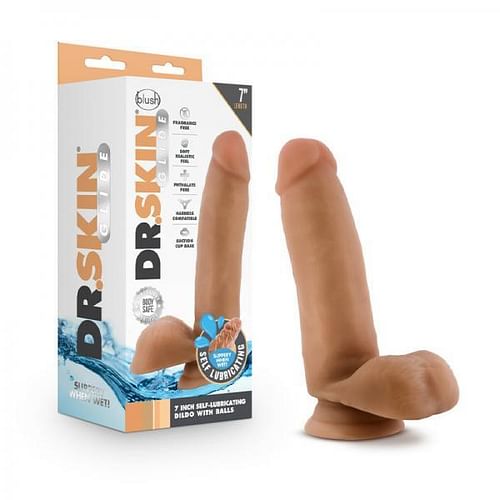 The doctor will see you now! The Dr. Skin Glide 7-Inch Self-Lubricating Dildo with Balls is a realistic, self-lubricating toy that only needs a bit of water to get slippery! The Dr. Skin Glide has a sturdy suction cup base that will hold to any flat surface and is harness compatible. Made from body-safe TPE, this toy contains no fragrances, phthalates, paraffins, or latex. Self-lubricating properties are temporary. It will last up to 12 uses. To clean, wash with soap and water. Pat dry and allow to air dry before storing. Use product only with water-based lubricants. It is recommended to start using water-based lubricants after self-lubricating properties begin to diminish.