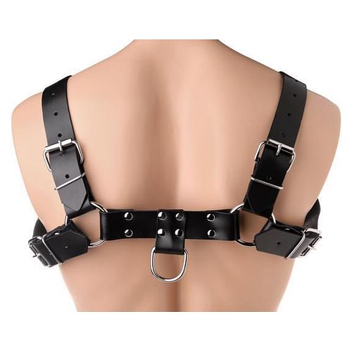 This enticing chest harness will wrap your partner in leather and metal for an exciting look and exotic feel. Featuring multiple points of adjustment, this harness is designed to adorn his chest and add to the look and feel of your next bondage scene. A D-ring at the front and back allow you to attach ropes, leashes, or restraints for more bondage possibilities. Let this sexy piece spark your imagination.