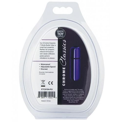 Erotic Toy Company Chrome Classics 7 Mode Metallic Bullet Vibe is small but powerful. Perfect for pinpoint clitoral stimulation with seven different pulse pattern vibrations to please. Waterproof vibrations. Made using body safe ABS Plastic. Bullet vibrator requires 3 tab batteries, included. Chrome Classics from Erotic Toy Company. Color Purple.