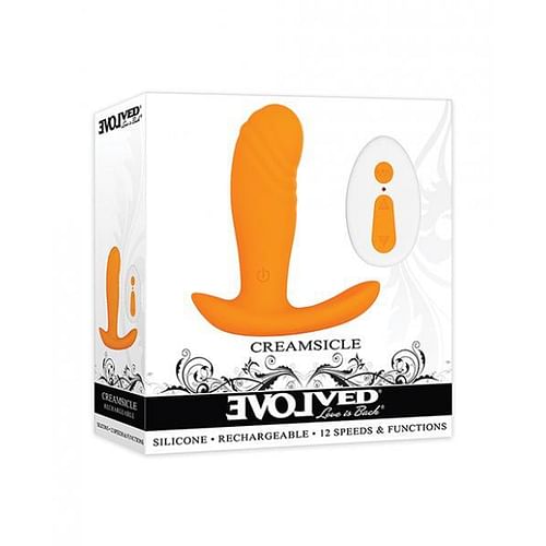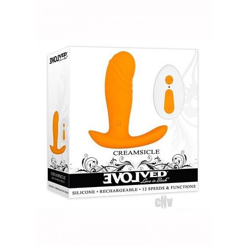 Evovled Creamsicle Vibrating Probe from Evolved Novelties. Dreamy retro orange meets petite phallic girth with the smooth, silicone Creamsicle. Tuck it where you want it most and rev up to 6 speeds with 2 intensities each to build to an intensely tasty climax completely hidden from view! With an ergonomic 3 button remote you can operate yourself or give to a partner, imagine the erotic possibilities, including underwater play as it is completely submersible. Dimensions length 3.43 inches, insertable 3 inches, width 1.18 inches. Made from creamy smooth silicone. Remote range of 25 feet. Waterproof and submersible. USB rechargeable, cable included. Remote control requires 1 CR2032 battery, included. 5 years warranty.