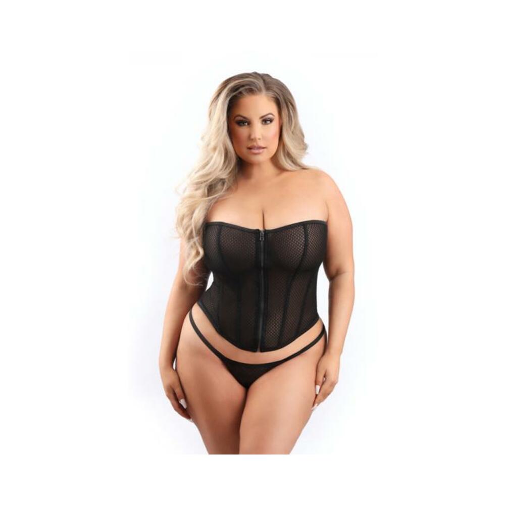 Mesh Overbust Corset with Front Zipper, Ribbon Lace-up Back and Matching G-string Panty Mesh fabric Zipper front Ribbon lace-up back G-string panty Materials: 95% Polyester, 5% SpandexSizing Info: 2XLSize: 12-16Bust: 44″-46″Hips: 44″-48″Also available in S, M, L, XL