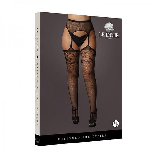 Fishnet garterbelt stockings with a lace top. This style fits size 2XL-5XL. Thong not included.