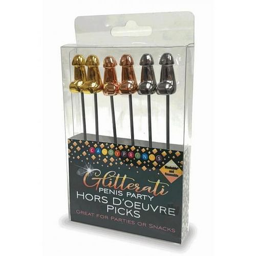 Each pack of Glitterati appetizer picks contains six 7-inch stainless still reusable skewers. These washable skewers come in metallic (2) gold, (2) rose gold, and (2) silver colors. Our elegant Glitterati picks are the newest addition to our Glitterati line of party wares and are a great way to incorporate the penis theme into your appetizer tray for any bachelorette or adult-themed party.