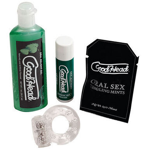 Transforming average head into GoodHead! The GoodHead Kit for HIM provides all the essential oral sex tools to make something already wonderful….even more “wonderfuller”. Flavored GoodHead lip balm will keep your lips soft and ready for that special below the belt kiss. Delicious cool mint GoodHead gel tastes so good you won’t ever want to come up for air. Pop one of the oral sex tingling mints in your mouth and unleash a tingling frenzy. Slip on the one size fits all disposable vibrating love ring on him or over your palm and watch him light up with joy! Think you know everything about oral sex? Learn some new tricks with the included GoodHead tips card. Kit includes 1 fl. oz. (29.6 ml) Mint flavored GoodHead Oral Gel, 4-Pack of Tingling GoodHead oral sex mints, Flavored GoodHead lip balm, Vibrating love ring (1 cell battery included), and the GoodHead for HIM tips card.