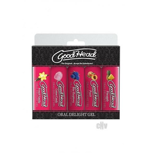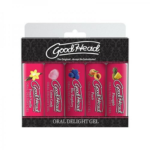 Just put your lips together and blow with Doc Johnson`s GoodHead gels. This 5-pack includes a 1-oz bottle of each French Vanilla, Cotton Candy, Blue Raspberry, Peach, and Pineapple flavors. Try for yourself and see how this edible oral sex enhancer turns foreplay into an unforgettable experience.