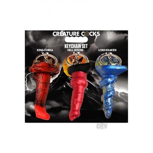 Let your freaky side show and flag that you’re into fantasy roleplay or mythical sex with this keychain set! This colorful set of miniaturized dildos include the Hell-Hound, Lord Kraken, and King Cobra! Place them with your keys, attach them to your phone case, clip them onto a bag or purse, or hang them from your rearview mirror to add a little flair and kinky fun! All the little dongs are made out of premium, phthalate-free, body-safe silicone and the metal is nickel-free for sensitive skin. Not meant for internal use. Novelty item only. Measurements : Hell-Hound: 2.9 inches x 1.6 inches x 1.2 inches. Lord Kraken: 2.9 inches x 1.8 inches x 1.5 inches. King Cobra: 2.9 inches x 1.5 inches x 1.6 inches. Materials : Silicone, metal Color : Red and Black, Blue and Gold