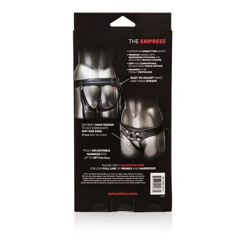 Her Royal Harness The Empress O/S from Cal Exotics. Thoughtfully architecture for mutual pleasure. Make more of your intimate moments. Non-tarnishing and nickel free, this product is safe and worry free. Bulk weight 12.4 ounces. Materials Vegan Leather, Polypropylene PP, Nickel free alloy metal, Polyoxymethylene POM, Plastic. Warranty information. Order with confidence as this item comes with our standard 90 day warranty. Measurements 59 inches waist. 2 inches ring diameter.