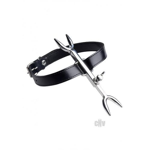 Deviate from the norm with a posture collar that is anything but average! The Heretics Fork keeps your slaves chin high with a sadistic double-ended prong that digs into the tender flesh of their chest and neck if they do not keep the pressure off! Adjust and fasten the sleek and attractive leather collar around their throat and use the thumb-screw to alter the length of the fork. Force your lovers head back as far as you wish! The striking aesthetic of this unique posture collar will heighten arousal for both of you, creating a more intense scene! Measurements: Fork adjusts from 5.75 to 8.25 inches in length. Collar is .8 inches wide and adjusts from 15 to 19 inches in circumference. Material: Stainless steel, leather. Color: Black.