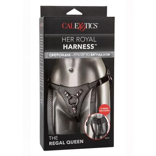 Prepare yourself for indulgent pleasure and premium probe play truly fit for royalty with The Regal Queen. The Her Royal Harness luxurious harness is made for a performance and comfort with a corset-like lace design, plush velvety lining and adjustable buckle enclosure. The bold crotchless design appeals to even the most dominant with the discreet snaps made to accommodate any size probe ring. The designer vegan leather, corset style details and plushy velvet liner give you the ultimate control over comfort. Dimensions: Waist Circumference: 64 in. Large Ring Diameter: 2 in. Medium Ring Diameter: 1.75 in. Small Ring Diameter: 1.5 in. Package: 2 x 5.75 x 11.25 in.