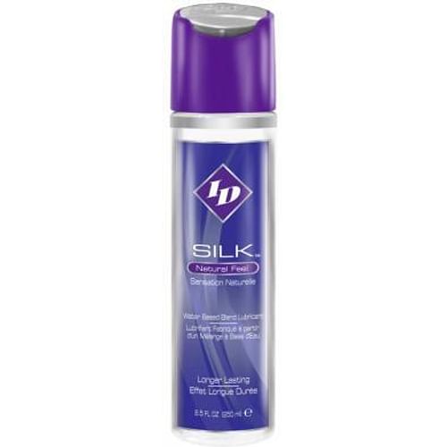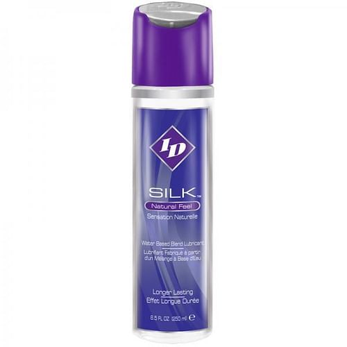 ID Silk Personal Lubricant Silicone and Water Blend. Natural Feel. Enjoy the ease of a water based lube with the slickness of a silicone lube with ID Silk! Slippery and smooth, non-tacky and long lasting, ID Silk effectively blends the best qualities of both lubricants. Easy to clean after use, ID Silk leaves skin feeling supple and smooth. Non-staining and latex safe, ID Silk is excellent for massage, too! Features: natural feel, latex condom compatible. Silicone and Water Blend formula. Enhances masturbation.