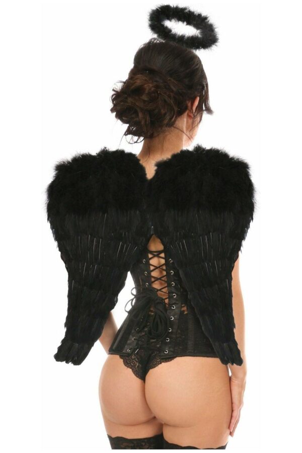 - Costume Includes: Sheer Lace Underbust Corset, Feather Angel Wings, Halo