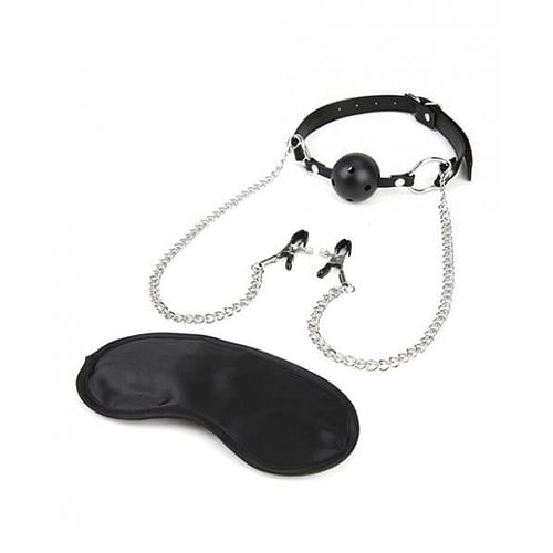 Lux Fetish Breathable Ball Gag Nipple Clamps with Chain. Includes a Satin Blindfold. Two BDSM must haves come together to provide a kinky experience that you will never forget. A beginners friendly breathable ball gag attaches to a set of adjustable nipple clamps that offer a tailored sensation, allowing you to push the limits of tantalizing torture.