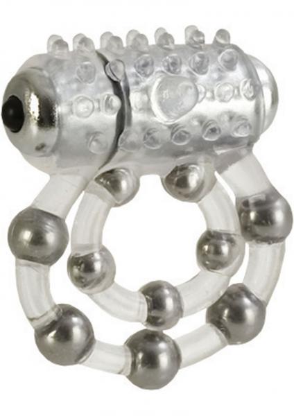 Experience new sensations and long lasting erections with this double-support vibrating penis ring. Super stretchy to accommodate most sizes. The smaller ring goes over the shaft while the larger ring wraps around the testicles, creating intense pressure and blood flow for very powerful and long lasting erections. The central ring also features five stroker beads to increase the pleasure and sensations on the penis, while the secondary ring goes around the testicles and has 5 stroker beads of its own. A removable micro-stimulator just above the rings in a textured portion that is covered in raised nubs, ideal for direct clitoral stimulation as you penetrate. Designed to stimulate both you and your partner, this ring will prolong ejaculation and maintain your erection for all your intimate encounters. Phthalates free. Requires 3 button cell batteries which are included.