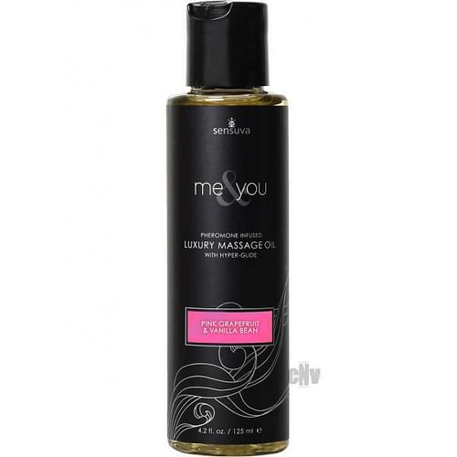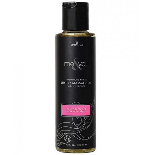The Me & You Pheromone Infused Luxury Massage Oil with Hyper Glide Massage Oil Pink Grapefruit and Vanilla Bean 4.2 ounces. This new line of luxury massage oils and lotions are infused with gender friendly pheromones to make both partners feel attractive and turned on. Sensuva has added a special hyper-glide which has a touch of silicone so that your massage oil or lotion can stay on the surface of your skin longer. A little bit goes a long way, and you will end up using less product and be able to enjoy a longer lasting massage. The entire line ranges from simple clean scents, to provocative blends including exotic floras, sweet and dark fruits, sugars, and aphrodisiacs. They are all made with natural ingredients and a blend of moisture rich oils, essential oils and natural preservatives.