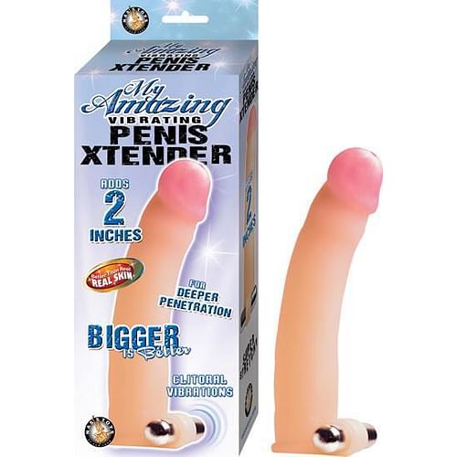 My Amazing Vibrating Penis Xtender Beige. Better than Real Realskin. Adds 2 inches in length for deeper penetration. Clitoral vibrations. Removable bullet vibrator. Waterproof vibrations. Made from body safe, phthalates free materials: sleeve Thermoplastic Rubber TPR, bullet vibrator ABS plastic. Size penis extension sleeve length 6 inches, diameter 1.375 inches, circumference 4.625 inches, bullet vibrator length 2.25 inches. Bullet vibrator requires 3 LR44/AG13 batteries, included.