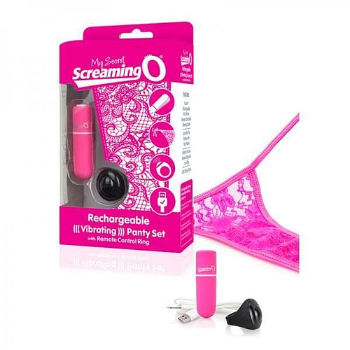 My Secret Screaming O Charged Remote Control Panty Vibe rechargeable remote control vibrating panty set. Deep, rumbling Vooom vibration. Silicone remote looks like a finger ring. Side tie lace panty fits up to 60 inches waists. Made of lab tested, body safe ABS plastic and silicone. Enjoy a sexy night or play in public with My Secret Charged Remote Control Panty Vibe, a waterproof 10 function rechargeable Vooom bullet that fits discreetly into a side tie lace panty.