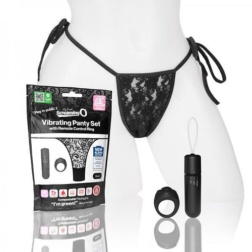 My Secret Screaming O 4T Panty Vibe puts the power of pleasure at your fingertips with a powerful, 4T treble style tickle and tease vibrating bullet that fits discreetly into a side-tie lace panty to keep it in place. Simply slip the bullet into the panty`s small pocket and enjoy powerful stimulation directly on the sweet spot. This sexy and subtle mini vibe allows you play in public with a clever remote control disguised as an ordinary finger ring and works up to 50 feet away! The vibe is monogamous meaning it can only speak to one remote at a time. This way, you always know who is turning you on!