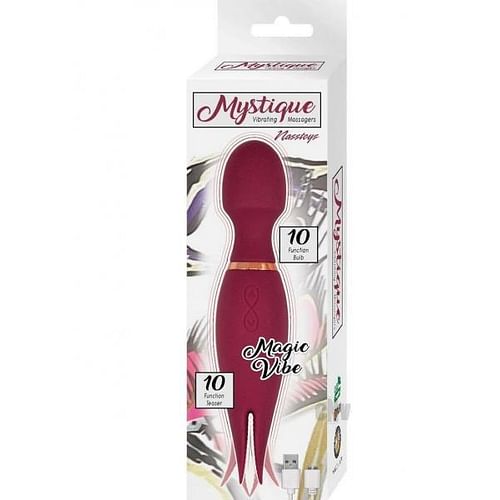 Mystique Magic Vibe is perfect for massage, couples, or solo play! Dual motors deliver powerful rumbly vibrations to relax tense muscles or achieve powerful orgasms. The flexible wand head features 10 gyrating patterns which can be controlled independently from it opposite end; featuring twin silicone ticklers which are perfect for nipples, the clitoris, under the testicles, and more! Press and hold the center button to power on then press the button on each end to engage the dual motors. Press and hold the center button again to power off. To charge, connect the magnetic charging points on the charger to the base of the product then plug the USB end into a power source. Please clean with toy cleaner before and after each use. Enjoy with a water-based lubricant. 10 Powerful bulb vibrations10 Powerful teaser vibrationsBody safe siliconeRoHS compliant Phthalates freeWaterproofMaterials: Silicone and ABSSize: Length – 7.25, Insertable length – 1.5Rechargeable: Charging Time – 90 mins., Working Time – 50 mins., Voltage – 3.7V