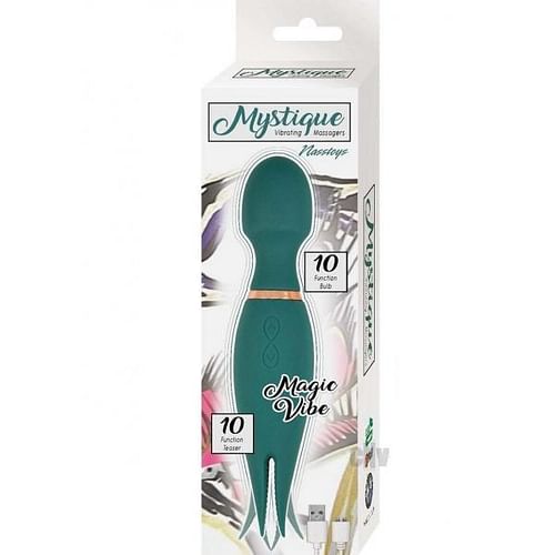 Mystique Magic Vibe is perfect for massage, couples, or solo play!  Dual motors deliver powerful rumbly vibrations to relax tense muscles or achieve powerful orgasms.  The flexible wand head features 10 gyrating patterns which can be controlled independently from it opposite end; featuring twin silicone ticklers which are perfect for nipples, the clitoris, under the testicles, and more!  Press and hold the center button to power on then press the button on each end to engage the dual motors.  Press and hold the center button again to power off. To charge, connect the magnetic charging points on the charger to the base of the product then plug the USB end into a power source.  Please clean with toy cleaner before and after each use.  Enjoy with a water-based lubricant. 10 Powerful bulb vibrations10 Powerful teaser vibrationsBody safe siliconeRoHS compliant Phthalates freeWaterproofMaterials: Silicone and ABSSize: Length – 7.25, Insertable length – 1.5Rechargeable: Charging Time – 90 mins., Working Time – 50 mins., Voltage – 3.7V