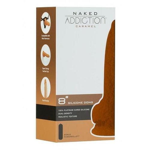 The dual-density Caramel edition from Naked Addiction is an 8 silicone masterpiece that will leave you wanting more! Made with 100% IncrediFeel platinum cured silicone*, this dildo is unbelievably soft to the touch, yet firm where needed for an ultra-realistic experience. With an extreme suction base, this toy can be attached to almost any flat surface and remain secure for hours on end perfect for play that knows no limits! Its harness compatibility allows you to attach the dildo to a wide variety of harnesses, expanding your realm of pleasure. This Naked Addiction beauty is body safe, easy to clean, latex free and phthalate free. BONUS BULLET: Enjoy the bonus 3-speed PowerBullet with your purchase of this Naked Addiction dong!