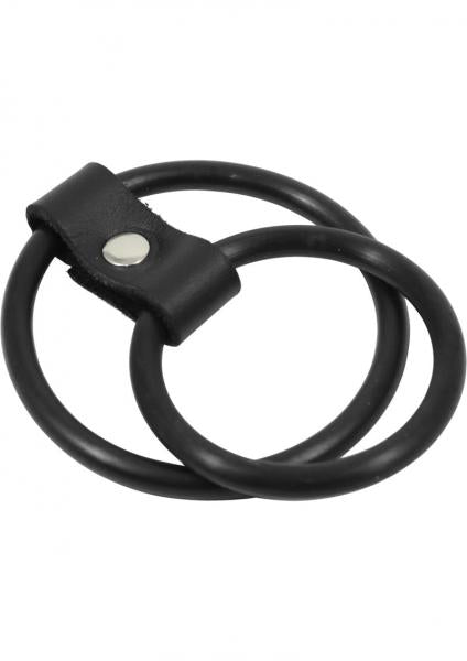 This dual cock ring includes a 2 inches base ring and a 1.5 inches shaft ring, held together with a leather strap.