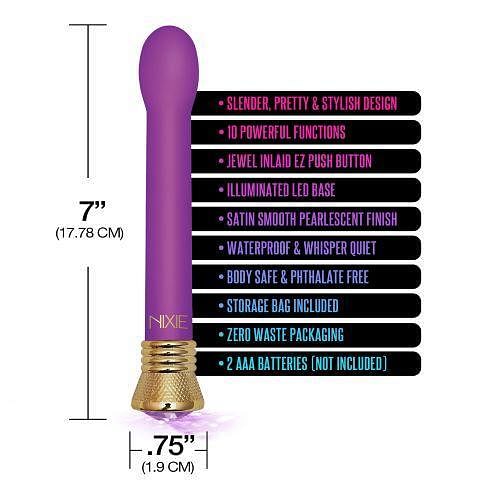 Ten powerful functions with a jewel-inlaid easy-push button and illuminated LED base. A smooth satin pearlescent finish on the 7?ǥ x .75?ǥ slender design. Waterproof, whisper quiet, body safe, and phthalate free. Storage bag included, zero-waste packaging. 2 AAA batteries (not included). 3 styles include: Classic, G-spot, and Bulb.
