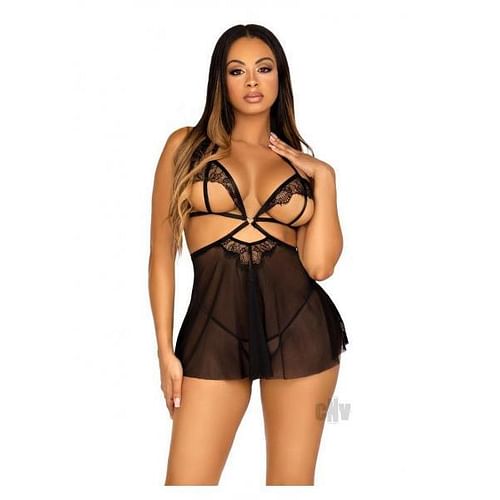 2 Pc Open Cup Eyelash Lace And Mesh Babydoll With Heart Ring Accent And Matching Panty. Black Large
