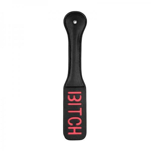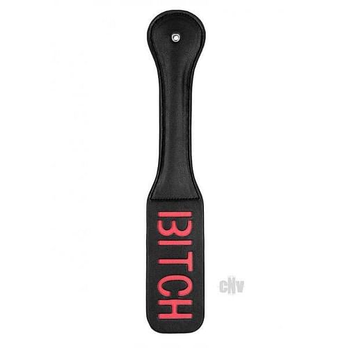 Ouch! Paddle – BITCH – Black. Leave a lasting impression on your sub. The word BITCH is reversed so it will show up on their skin. Made of firm but flexible stitched leather.