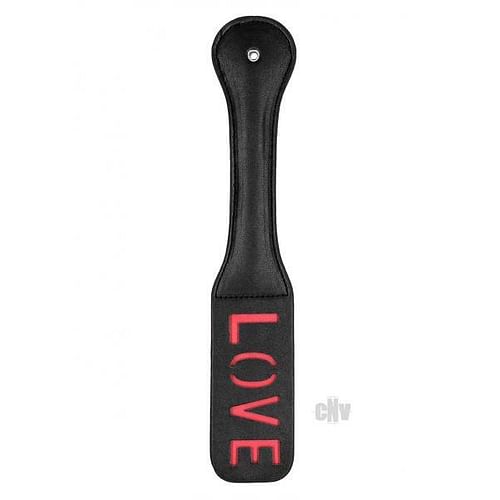 Ouch! Paddle – LOVE – Black. Leave a lasting impression on your sub. The word LOVE is reversed so it will show up on their skin. Made of firm but flexible stitched leather.
