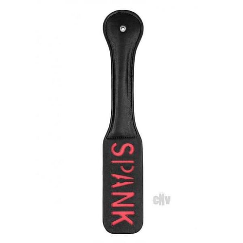 Ouch! Paddle – SPANK – Black. Leave a lasting impression on your sub. The word SPANK is reversed so it will show up on their skin. Made of firm but flexible stitched leather.