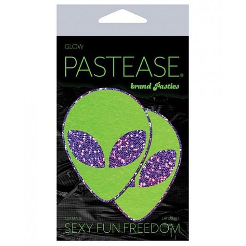 Neon Green/Glow in the Dark with Glittering Purple Eyes Nipple Pasties by Pastease® are hand-made in the USA of soft glittery material that forms to curves and resists wrinkling over hardening nipples. Just peel-and-stick on clean, dry skin. All Pastease® feature latex-free, medical-grade, waterproof adhesive that stay securely in place for as long as you like and until they are gently removed. Conceal or Reveal with Pastease® nipple pasties when worn with a sexy outfit, daring bikini, sheer top, revealing dress, Hefty bag, body lotion, crazy costume, party theme or nothing at all! Fear not humans….She comes in peace à à à  Dimensions: 2.4 inches X 3.1 inches. Coverage Diameter: 2.4 inches. *Charge under direct light for 15-30 minutes for maximum glow in the dark awesomeness!