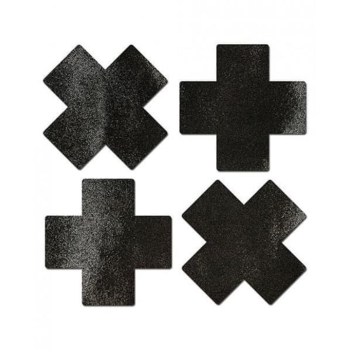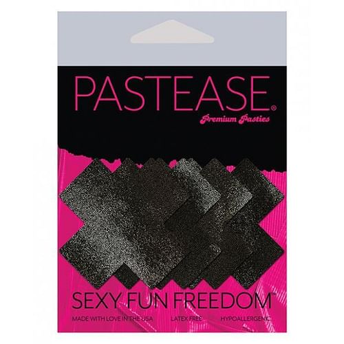 Petite Plus X Two Pair of Small Liquid Black Cross Nipple Pasties by Pastease are hand made in the USA of soft form fitting material that forms seamlessly to curves and resists wrinkling over hardening nipples. Just peel and stick on clean, dry skin. All Pastease feature latex free, medical grade, waterproof adhesive that stay securely in place for as long as you like and until they are gently removed.