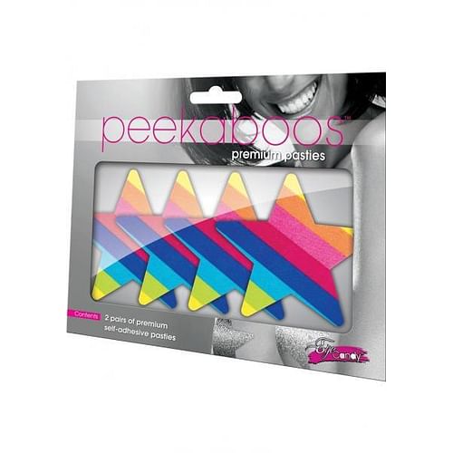 Peekaboo Premium Pasties Rainbow Starz. Contents two pairs of self adhesive pasties in the shape of Stars. Color Rainbow: Red, Orange, Yellow, Green, Blue, Indigo, Violet. Eye candy. 2 pairs.