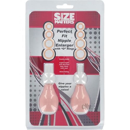 The Perfect Fit Nipple Enlarger is a sexy way to give yourself fuller, erect nipples by use of a double bulb pump. This enlarger has an added unique feature: four graduated O-rings to place over the nipples to keep them standing at attention for extended sessions! Simply place the desired size ring over the open end of the pump prior to pumping, fit the pump over the nipple, then pump away to your desired size. Slide the best suited ring over your now erect nipple, down to the base of the nipple. Now stand back and admire those perfectly perky tips! Two differently sized pumps are included for a custom fit to any nipple.