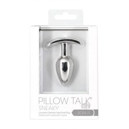Key Features:andbull; Luxurious Anal Plugandbull; Seamless Stainless Steelandbull; Tapered Shapeandbull; Dazzles with Swarovskiandreg; Crystalandbull; Heavier Weightandbull; Easy to Cleanandbull; Wide Baseandbull; Bonus PowerBulletandreg; Included!andbull; Bullet Requires 3 andldquo;LR44andrdquo; Batteries (Included) Dimensions:andbull; Length: 2.6 in.andbull; Width: 2 in.andbull; Insertable Length: 2.4 in.andbull; Diameter: 1 in.andbull; Weight: 153g Description:Indulge in a little secret with the Pillow Talkandreg; Sneaky Stainless Steel Anal Plug!This luxurious plug will open up the back door to the world of anal play. The tapered tip is designed for easy ion and its sleek, seamless design slides in smoothly. The wide base gives you precise control over where this plug sits and the dazzling Swarovskiandreg; crystal set in the base adds a glint of glamour to your tantalizing tush. The Pillow Talkandreg; Sneaky may be small and discreet but youandrsquo;ll definitely feel the weight of this noticeably naughty plug. At 153g, the Sneaky gives you an intense sensual feeling of fullness. Try it out during a night of blissful passion or steamy solo session.Donandrsquo;t let your backside have all the fun! Use the included PowerBulletandtrade; in tandem with your plug to give you pulsating vibrations alongside that sensual filling feeling. Use your favourite water-based lubricant for maximum pleasure and always wash your plug with a toy cleaner before and after every use.